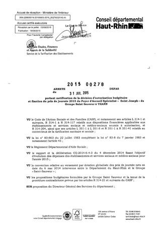 portant notification de la décision d'autorisation budgétaire et fixation du prix de journée 2015 du foyer d'accueil spécialisé "Saint Joseph" du groupe Saint Sauveur à THANN Resumé Pièces jointes ARRETE Assemblée : Non défini Date : 31/07/2015 Rapporteur : Non défini Collectivité : Conseil départemental du Haut-Rhin Direction : Non défini Service : Direction Etudes, Finances et Appuis de la Solidarité Domaine : Prix de Journée Commission :