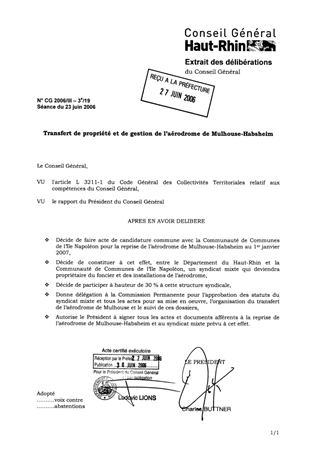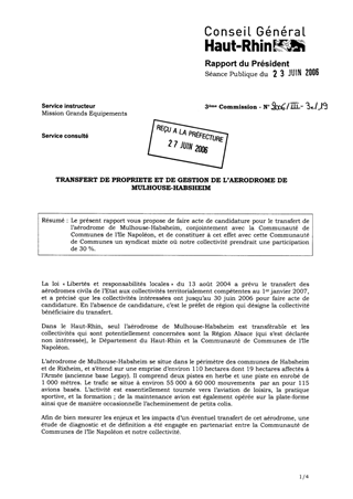 Le présent rapport vous propose de faire acte de candidature pour le transfert de l’aérodrome de Mulhouse-Habsheim, conjointement avec la Communauté de Communes de l’Ile Napoléon, et de constituer à cet effet avec cette Communauté de Communes un syndicat mixte où notre collectivité prendrait une participation de 30 %.