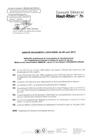 portant modification de l'autorisation de fonctionnement de l'établissement d'accueil d'enfants de moins de six ans "Multi-accueil Jean-Frédéric OBERLIN", sis au 12 rue d'Alsace à MULHOUSE (68200) Resumé Pièces jointes ARRETE Assemblée : Non défini Date : 05/08/2015 Rapporteur : Non défini Collectivité : Conseil départemental du Haut-Rhin Direction : Non défini Service : Direction Enfance Santé Insertion Domaine : Accueil d'enfants Commission :