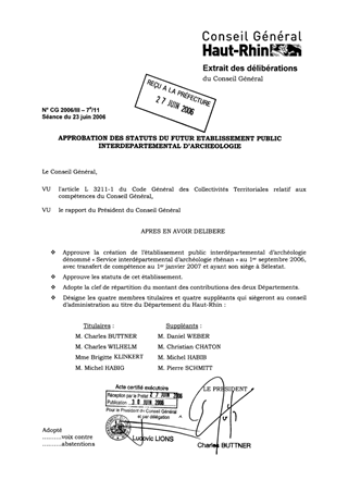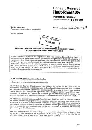 La réflexion portant sur l’opportunité d’un outil commun d’archéologie a abouti, à l’automne 2005, à un rapport commun qui concluait à la pertinence d’une telle démarche et engageait les deux Départements à la création d’un établissement public interdépartemental d’archéologie qui embrasse l’ensemble des champs d’application de cette discipline. De manière à concrétiser cette volonté commune, le présent rapport soumet à l’approbation des Conseil Généraux du Bas-Rhin et du Haut-Rhin la création de cet établissement public, l’adoption de ses statuts, la clef de répartition des contributions et la désignation des membres de son Conseil d’administration.