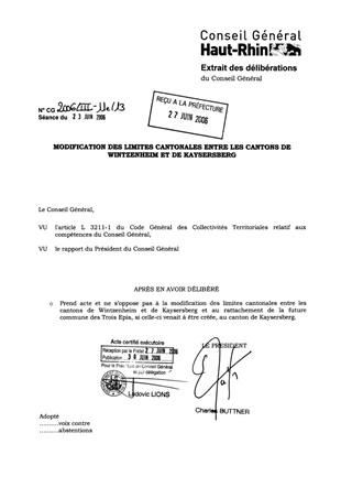 Modification des limites cantonales entre les cantons de WINTZENHEIM et KAYSERSBERG