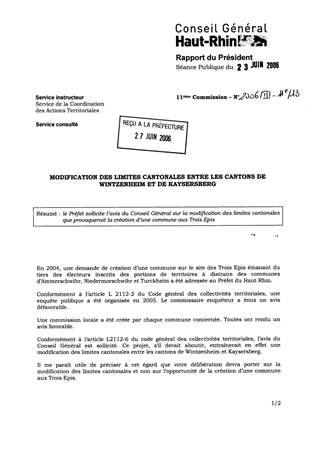 Le Préfet sollicite l’avis du Conseil Général sur la modification des limites cantonales que provoquerait la création d’une commune aux Trois Epis