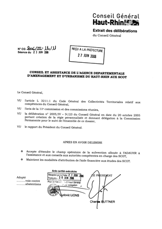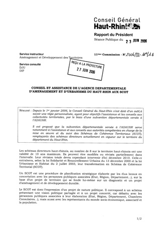 Depuis le 1er janvier 2006, le Conseil Général du Haut-Rhin s’est doté d’un outil,à savoir une régie personnalisée, ayant pour objectifs l’assistance et les conseils aux collectivités territoriales, par le biais d’une subvention départementale versée à l’ADAUHR. Il est proposé que la subvention départementale versée à l’ADAUHR serve notamment à l’assistance et aux conseils aux autorités compétentes en charge de la mise en œuvre et du suivi des Schémas de Cohérence Territoriaux (SCOT), remplaçants des schémas directeurs actuellement en vigueur sur le territoire du département du Haut-Rhin.