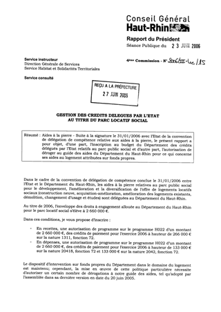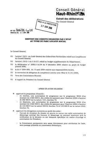 Aides à la pierre - Suite à la signature le 31/01/2006 avec l’Etat de la convention de délégation de compétence relative aux aides à la pierre, le présent rapport a pour objet, d’une part, l’inscription au budget du Département des crédits délégués par l’Etat relatifs au parc public social et d’autre part, l’autorisation de déroger au guide des aides du Département du Haut-Rhin pour ce qui concerne ses aides au logement attribuées sur fonds propres.