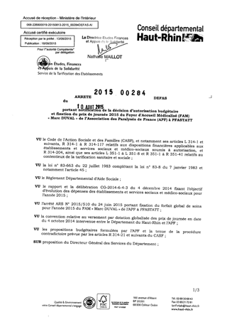 portant notification de la décision d'autorisation budgétaire et fixation du prix de journée 2015 du foyer d'accueil médicalisé (FAM) "Marc DUVAL " de l'Association des Paralysés de France (APF) à PFASTATT Resumé Pièces jointes ARRETE Assemblée : Non défini Date : 10/08/2015 Rapporteur : Non défini Collectivité : Conseil départemental du Haut-Rhin Direction : Non défini Service : Direction Etudes, Finances et Appuis de la Solidarité Domaine : Prix de Journée Commission :