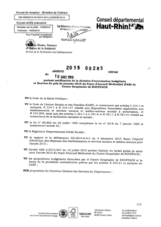 portant notification de la décision d'autorisation budgétaire et fixation du prix de journée 2015 du foyer d'accueil médicalisé (FAM) du centre hospitalier de ROUFFACH Resumé Pièces jointes ARRETE Assemblée : Non défini Date : 10/08/2015 Rapporteur : Non défini Collectivité : Conseil départemental du Haut-Rhin Direction : Non défini Service : Direction Etudes, Finances et Appuis de la Solidarité Domaine : Prix de Journée Commission :