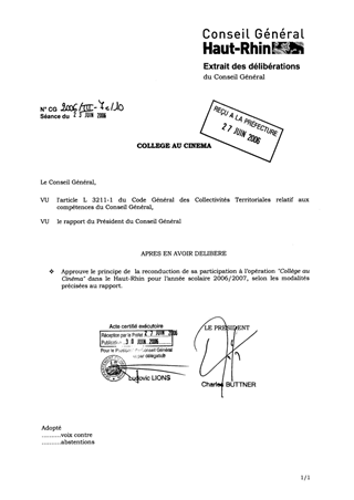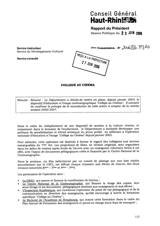Le Département a décidé de mettre en place, depuis janvier 2003, le dispositif d’éducation à l’image cinématographique "Collège au Cinéma". Il convient de confirmer le principe de la reconduction de cette action à compter de la rentrée scolaire 2006/2007.