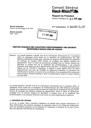 Le Conseil Général a décidé, lors de la Commission Permanente du 4 novembre 2005, la réalisation d’une étude sur la limitation de l’enfouissement des DIB (Déchets industriels banals), pour examiner les moyens d’économiser les capacités de stockage de l’unique CSDU (Centre de stockage des déchets ultimes) du département. Dans le cadre du partenariat privilégié avec le Conseil Général du Bas-Rhin et compte tenu de la similitude des problématiques, il est proposé d’étendre cette étude aux deux départements alsaciens : le montant prévisionnel de l’étude est de 150.000 € maximum, à répartir à parts égales entre les deux Départements (une aide de l’ADEME est également attendue).