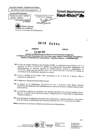 portant notification de la décision d'autorisation budgétaire et fixation du prix de journée 2015 du foyer pour adultes handicapés travailleurs (FAHT) Le Graethof de l'association "Papillons Blancs" à GUEBWILLER Resumé Pièces jointes ARRETE Assemblée : Non défini Date : 10/08/2015 Rapporteur : Non défini Collectivité : Conseil départemental du Haut-Rhin Direction : Non défini Service : Direction Etudes, Finances et Appuis de la Solidarité Domaine : Prix de Journée Commission :
