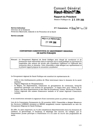 Le Groupement Régional de Santé Publique sera chargé de coordonner et de promouvoir toute intervention dans le domaine de la santé publique en favorisant la coopération des acteurs de terrain afin d’améliorer l’efficience et l’efficacité des ressources dans ce domaine. Votre Assemblée a déjà désigné ses représentants et le présent rapport propose la convention constitutive