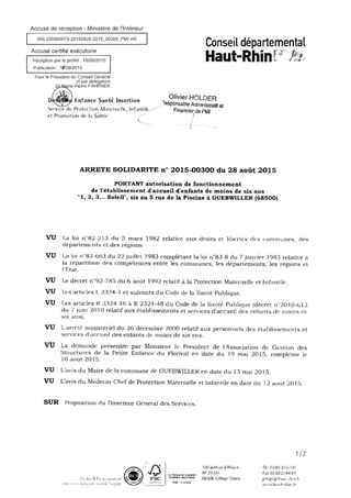 portant autorisation de fonctionnement de l'établissement d'accueil d'enfants de moins de six ans "1, 2, 3... Soleil, sis au 5 rue de la Piscine à GUEBWILLER (68500) Resumé Pièces jointes ARRETE Assemblée : Non défini Date : 28/08/2015 Rapporteur : Non défini Collectivité : Conseil départemental du Haut-Rhin Direction : Non défini Service : Direction Enfance Santé Insertion Domaine : Accueil d'enfants Commission :