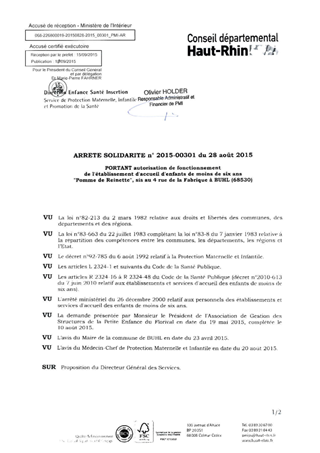 portant autorisation de fonctionnement de l'établissement d'accueil d'enfants de moins de six ans "Pomme de Reinette", si au 4 rue de la Fabrique à BUHL (68530) Resumé Pièces jointes ARRETE Assemblée : Non défini Date : 28/08/2015 Rapporteur : Non défini Collectivité : Conseil départemental du Haut-Rhin Direction : Non défini Service : Direction Enfance Santé Insertion Domaine : Accueil d'enfants Commission :