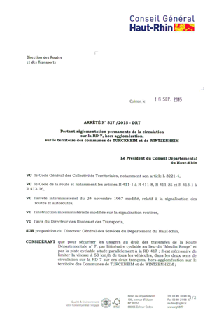 portant réglementation permanente de la circulation sur la RD 7, hors agglomératiion, sur le territoire des communes de TURCKHEIM et de WINTZENHEIM Resumé Pièces jointes ARRETE Assemblée : Non défini Date : 10/09/2015 Rapporteur : Non défini Collectivité : Conseil départemental du Haut-Rhin Direction : Non défini Service : Direction des Routes Domaine : Circulation Commission :
