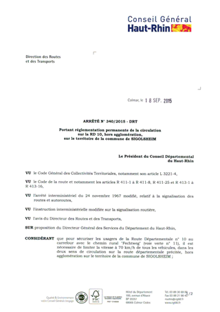 portant réglementation permanente de la circulation sur la RD 10, hors agglomération, sur le territoire de la commune de SIGOLSHEIM Resumé Pièces jointes ARRETE Assemblée : Non défini Date : 18/09/2015 Rapporteur : Non défini Collectivité : Conseil départemental du Haut-Rhin Direction : Non défini Service : Direction des Routes Domaine : Circulation Commission :