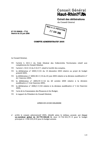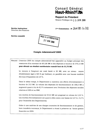 L’exercice 2005 du compte administratif fait apparaître au budget principal des ressources d’un montant de 601,86 M€ et des dépenses à hauteur de 570,13 M€ pour obtenir un résultat excédentaire cumulé brut de 31,73 M€.