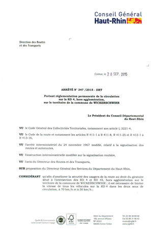portant réglementation permanente de la circulation sur la RD 4, hors agglomération, sur le territoire de la commune de WICKERSCHWIHR Resumé Pièces jointes ARRETE Assemblée : Non défini Date : 28/09/2015 Rapporteur : Non défini Collectivité : Conseil départemental du Haut-Rhin Direction : Non défini Service : Direction des Routes Domaine : Circulation Commission :