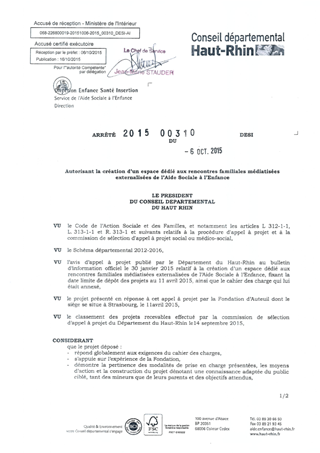 autorisant la création d'un espace dédié aux rencontres familiales médiatisées externalisées de l'Aide Sociale à l'Enfance Resumé Pièces jointes ARRETE Assemblée : Non défini Date : 06/10/2015 Rapporteur : Non défini Collectivité : Conseil départemental du Haut-Rhin Direction : Non défini Service : Direction Enfance Santé Insertion Domaine : Autres (non classés) Commission :