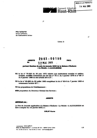 portant fixation du prix de journée 2003 de la maison d'enfants "La Nichée" à ALGOLSHEIM. Resumé Pièces jointes ARRETE Assemblée : Non défini Date : 12/05/2003 Rapporteur : Non défini Collectivité : Conseil départemental du Haut-Rhin Direction : Non défini Service : Direction de la Solidarité Domaine : Prix de Journée Commission :