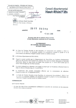 portant rejet de la création d'un service d'aide éducative renforcée de 21 mesures Resumé Pièces jointes ARRETE Assemblée : Non défini Date : 06/10/2015 Rapporteur : Non défini Collectivité : Conseil départemental du Haut-Rhin Direction : Non défini Service : Direction Enfance Santé Insertion Domaine : Autres (non classés) Commission :