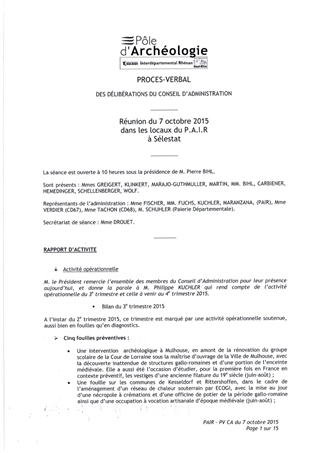 des délibérations du Conseil d'Administration du Pôle d'Archéologie Interdépartemental Rhénan - Réunion du 7 octobre 2015 Resumé Pièces jointes ARRETE Assemblée : Non défini Date : 07/10/2015 Rapporteur : Non défini Collectivité : Conseil départemental du Haut-Rhin Direction : Non défini Service : Direction de l'Éducation, de la Culture et des Sports Domaine : Autres (non classés) Commission :