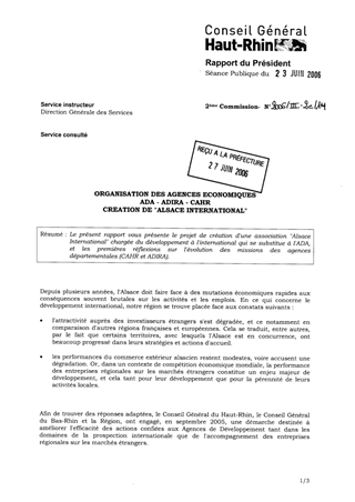 Le présent rapport vous présente le projet de création d'une association "Alsace International" chargée du développement à l'international qui se substitue à l'ADA, et les premières réflexions sur l'évolution des missions des agences départementales (CAHR et ADIRA).
