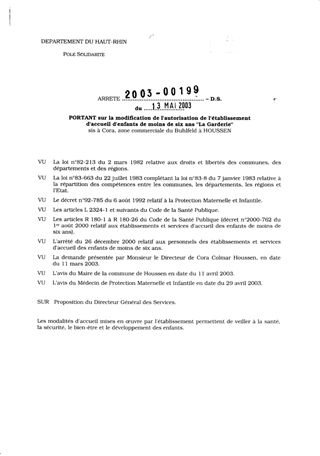 portant sur la modification de l'autorisation de l'établissement d'accueil d'enfants de moins de six ans "La Garderie" sis à Cora, zone commerciale du Buhlfeld à HOUSSEN. Resumé Pièces jointes ARRETE Assemblée : Non défini Date : 13/05/2003 Rapporteur : Non défini Collectivité : Conseil départemental du Haut-Rhin Direction : Non défini Service : Direction de la Solidarité Domaine : Accueil d'enfants Commission :