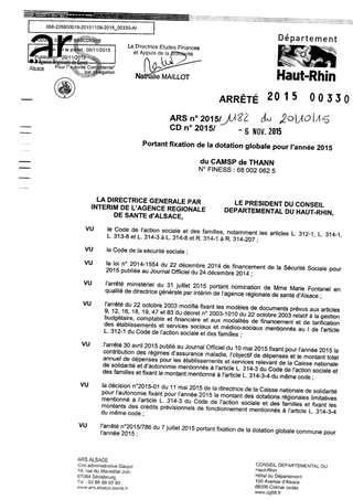 portant fixation de la dotation globale pour l'année 2015 du CAMSP de THANN Resumé Pièces jointes ARRETE Assemblée : Non défini Date : 20/10/2015 Rapporteur : Non défini Collectivité : Conseil départemental du Haut-Rhin Direction : Non défini Service : Direction de l'Autonomie Domaine : Dotations financières Commission :