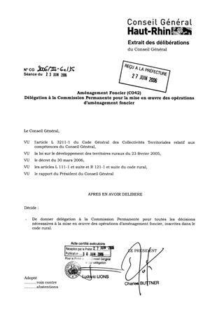 La loi du 23 février 2005 sur le développement des territoires ruraux a décentralisé l’aménagement foncier en confiant aux Départements la responsabilité globale de la conduite des procédures d’aménagement foncier à compter du 1er janvier 2006. Il vous est proposé de donner délégation à la Commission Permanente pour toutes les décisions nécessaires à la mise en oeuvre des opérations d’aménagement foncier.