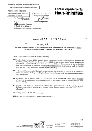 portant modification de la dotation globale de financement 2015 allouée au Centre d'Action médico-sociale précoce "Les Acacias" à ILLZACH Resumé Pièces jointes ARRETE Assemblée : Non défini Date : 06/11/2015 Rapporteur : Non défini Collectivité : Conseil départemental du Haut-Rhin Direction : Non défini Service : Direction Etudes, Finances et Appuis de la Solidarité Domaine : Dotations financières Commission :