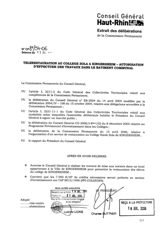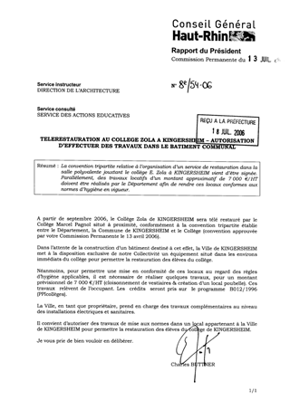 Télérestauration au collège Zola à KINGERSHEIM. Autoristion d'effectuer des travaux dans le bâtiment communal