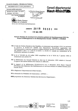 portant fixation du montant de la dotation globale de fonctionnement 2015 du centre d'hébergement et de réadaptation sociale "APPUIS" à COLMAR Resumé Pièces jointes ARRETE Assemblée : Non défini Date : 10/11/2015 Rapporteur : Non défini Collectivité : Conseil départemental du Haut-Rhin Direction : Non défini Service : Direction Etudes, Finances et Appuis de la Solidarité Domaine : Dotations financières Commission :