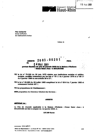 portant fixation du prix de journée 2003 de la maison d'enfants "Home Saint Jean" à MULHOUSE. Resumé Pièces jointes ARRETE Assemblée : Non défini Date : 14/05/2003 Rapporteur : Non défini Collectivité : Conseil départemental du Haut-Rhin Direction : Non défini Service : Direction de la Solidarité Domaine : Prix de Journée Commission :