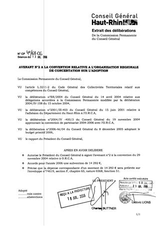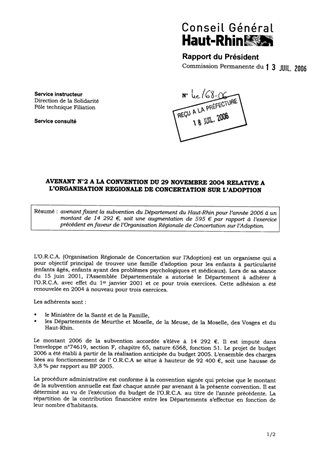 avenant fixant la subvention du Département du Haut-Rhin pour l’année 2006 à un montant de 14 292 €, soit une augmentation de 595 € par rapport à l’exercice précédent en faveur de l’Organisation Régionale de Concertation sur l’Adoption.