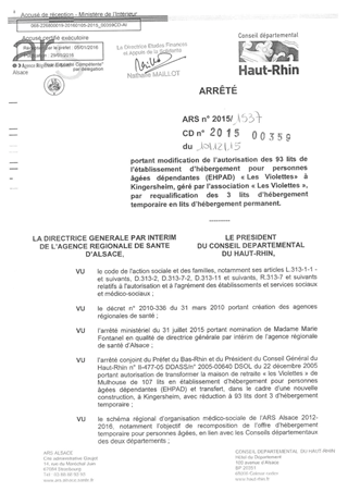 portant modification de l'autorisation des 93 lits de l'établissement d'hébergement pour personnes âgées dépendantes (EHPAD) "Les Violettes" à KINGERSHEI, géré par l'association "Les Violettes", par requalification des 3 lits d'hébergement temporaire en l