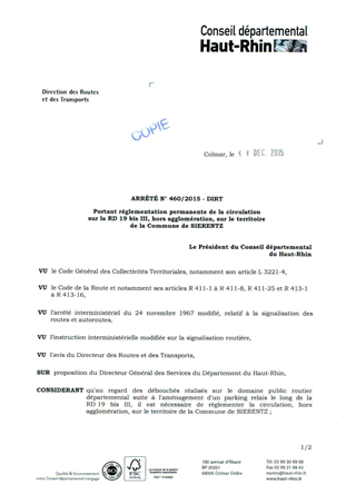 portant réglementation permanente de la circulation sur la RD 19 bis III, hors agglomération, sur le territoire de la commune de SIERENTZ Resumé Pièces jointes ARRETE Assemblée : Non défini Date : 11/12/2015 Rapporteur : Non défini Collectivité : Conseil départemental du Haut-Rhin Direction : Non défini Service : Direction des Routes Domaine : Circulation Commission :