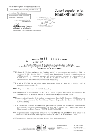 portant notification de la décision d'autorisation budgétaire et fixation des prix de journée hébergement et des tarifs dépendance 2016 de l'EHPAD de SOULTZMATT Resumé Pièces jointes ARRETE Assemblée : Non défini Date : 14/12/2015 Rapporteur : Non défini Collectivité : Conseil départemental du Haut-Rhin Direction : Non défini Service : Direction Etudes, Finances et Appuis de la Solidarité Domaine : Prix de Journée Commission :