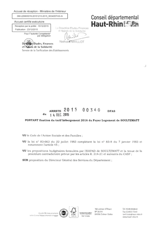 portant fixation du tarif hébergement 2016 du foyer logement de SOULTZMATT Resumé Pièces jointes ARRETE Assemblée : Non défini Date : 14/12/2015 Rapporteur : Non défini Collectivité : Conseil départemental du Haut-Rhin Direction : Non défini Service : Direction Etudes, Finances et Appuis de la Solidarité Domaine : Prix de Journée Commission :