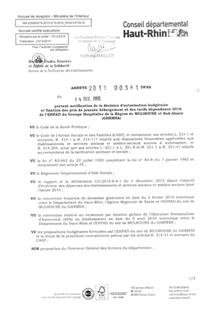 portant notification de la décision d'autorisation budgétaire et fixation des prix de journée hébergement et des tarifs dépendance 2016 de l'EHPAD du groupe hospitalier de la région de Mulhouse et Sud-Alsace (GHRMAS) Resumé Pièces jointes ARRETE Assemblée : Non défini Date : 14/12/2015 Rapporteur : Non défini Collectivité : Conseil départemental du Haut-Rhin Direction : Non défini Service : Direction Etudes, Finances et Appuis de la Solidarité Domaine : Prix de Journée Commission :