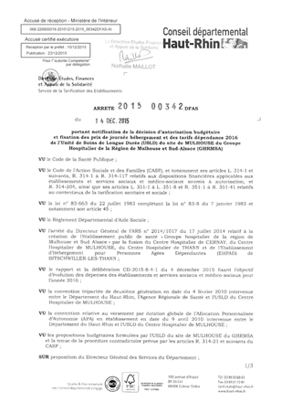 portant notification de la décision d'autorisation budgétaire et fixation des prix de journée hébergement et des tarifs dépendance 2016 de l'unité de soins de longue durée (USLD) du site de Mulhouse du groupe hospitalier de la région de Mulhouse et Sud-Al