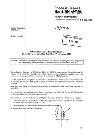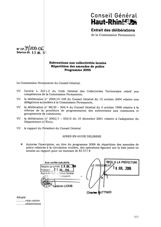 Subventions aux collectivités locales. Répartition des amendes de police. Programme 2006