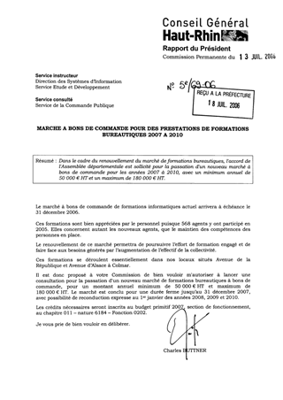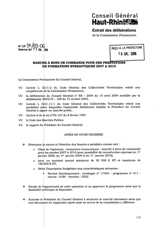 Dans le cadre du renouvellement du marché de formations bureautiques, l'accord de l'Assemblée départementale est sollicité pour la passation d'un nouveau marché à bons de commande pour les années 2007 à 2010, avec un minimum annuel de 50 000 € HT et un maximum de 180 000 € HT.