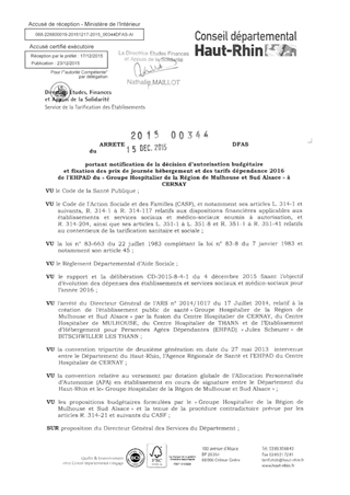 portant notification de la décision d'autorisation budgétaire et fixation des prix de journée hébergement et des tarifs dépendance 2016 de l'EHPAD du "Groupe hospitalier de la région de Mulhouse et Sud Alsace à CERNAY Resumé Pièces jointes ARRETE Assemblée : Non défini Date : 15/12/2015 Rapporteur : Non défini Collectivité : Conseil départemental du Haut-Rhin Direction : Non défini Service : Direction Etudes, Finances et Appuis de la Solidarité Domaine : Prix de Journée Commission :