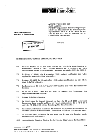 portant organisation de l'enquête publique relative au déclassement du domaine public départemental de la RD 8 bis I entre les RD 432 et RD 433 sur le territoire de la commune de BRUNSTATT. Resumé Pièces jointes ARRETE Assemblée : Non défini Date : 19/05/2003 Rapporteur : Non défini Collectivité : Conseil départemental du Haut-Rhin Direction : Non défini Service : Service du Patrimoine et du droit des Sols Domaine : Déclassement de voirie Commission :