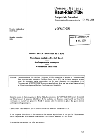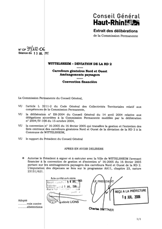 La convention n°16-2005 du 16 février 2005 a transféré la gestion et l’entretien des îlots centraux des giratoires Nord et Ouest de la RD2. Le présent avenant a pour objet de compléter cette convention sur le volet financier en transférant à la Commune de WITTELSHEIM la somme équivalente à ce qui aurait été dépensé par le Département pour effectuer l’aménagement des îlots.