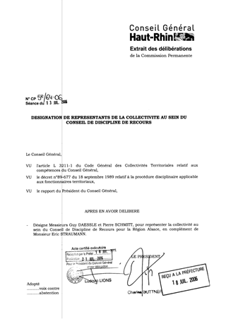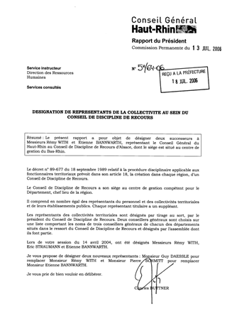 Le présent rapport a pour objet de désigner deux successeurs à Messieurs Rémy WITH et Etienne BANNWARTH, représentant le Conseil Général du Haut Rhin au Conseil de Discipline de Recours d’Alsace, dont le siège est situé au centre de gestion du Bas-Rhin.