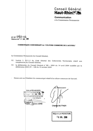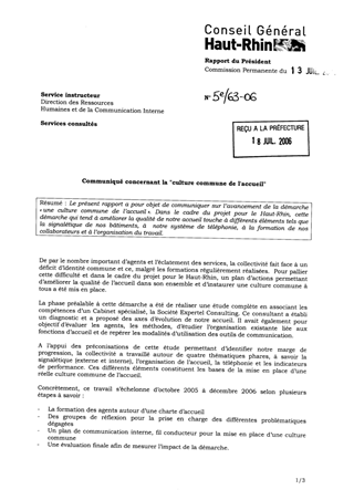 : Le présent rapport a pour objet de communiquer sur l’avancement de la démarche « une culture commune de l’accueil ». Dans le cadre du projet pour le Haut-Rhin, cette démarche qui tend à améliorer la qualité de notre accueil touche à différents éléments tels que la signalétique de nos bâtiments, à notre système de téléphonie, à la formation de nos collaborateurs et à l’organisation du travail.