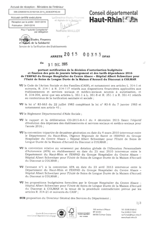 portant notification de la décision d'autorisation budgétaire et fixation des prix de journée hébergement et des tarifs dépendance 2016 de l'EHPAD du groupe hospitalier du Centre Alsace - Hôpital Albert Schweitzer pour l'unité de soins de longue durée de