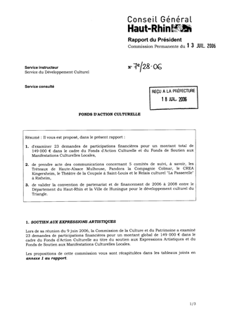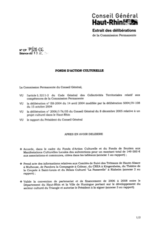 Il vous est proposé, dans le présent rapport : 1.d'examiner 23 demandes de participations financières pour un montant total de 149 000 € dans le cadre du Fonds d'Action Culturelle et du Fonds de Soutien aux Manifestations Culturelles Locales, - 2.de prendre acte des communications concernant 5 comités de suivi, à savoir, les Tréteaux de Haute-Alsace Mulhouse, Pandora la Compagnie Colmar, le CREA Kingersheim, le Théâtre de la Coupole à Saint-Louis et le Relais culturel "La Passerelle" à Rixheim, - 3.de valider la convention de partenariat et de financement de 2006 à 2008 entre le Département du Haut-Rhin et la Ville de Huningue pour le développement culturel du Triangle.