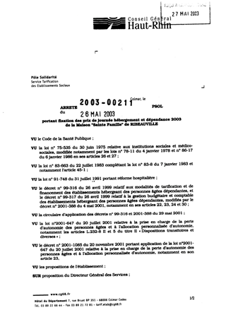 portant fixation des prix de journée hébergement et dépendance 2003 de la Maison "Sainte Famille" de RIBEAUVILLE. Resumé Pièces jointes ARRETE Assemblée : Non défini Date : 26/05/2003 Rapporteur : Non défini Collectivité : Conseil départemental du Haut-Rhin Direction : Non défini Service : Service de la Tarification des Etablissements Domaine : Prix de Journée Commission :