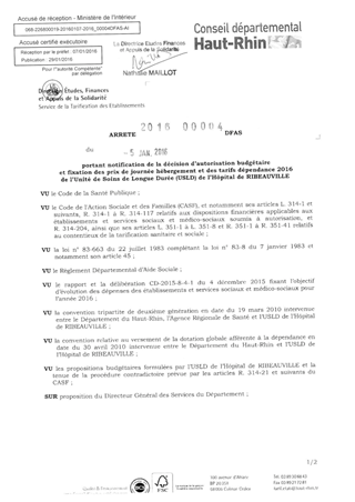 portant notification de la décision d'autorisation budgétaire et fixation des prix de journée hébergement et des tarifs dépendance 2016 de l'unité de soins de longue durée (USLD) de l'hôpital de RIBEAUVILLE Resumé Pièces jointes ARRETE Assemblée : Non défini Date : 05/01/2016 Rapporteur : Non défini Collectivité : Conseil départemental du Haut-Rhin Direction : Non défini Service : Direction Etudes, Finances et Appuis de la Solidarité Domaine : Prix de Journée Commission :
